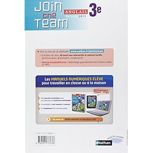 -Anglais - Join the Team 3e - Livre de l'élève ....Join the Team 3e (2013), un manuel d’anglais à la structure simple et dynamique. Une édition entièrement nouvelle pour préparer efficacement les élèves de 3e à la validation du niveau A2 (CECR) requis au Brevet.